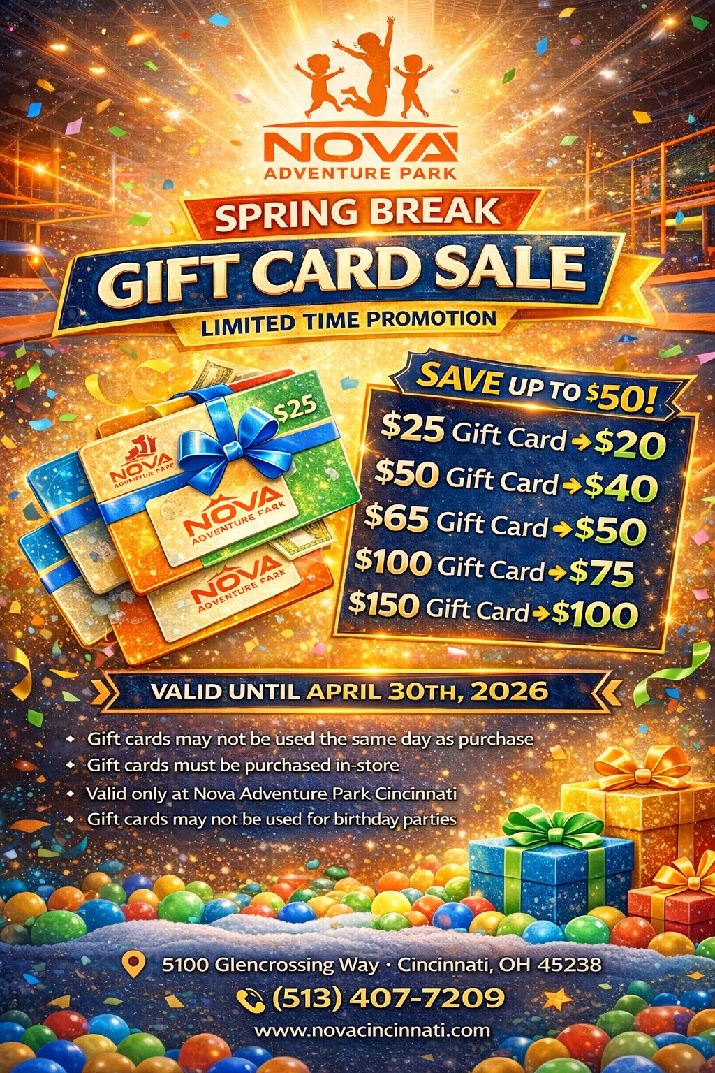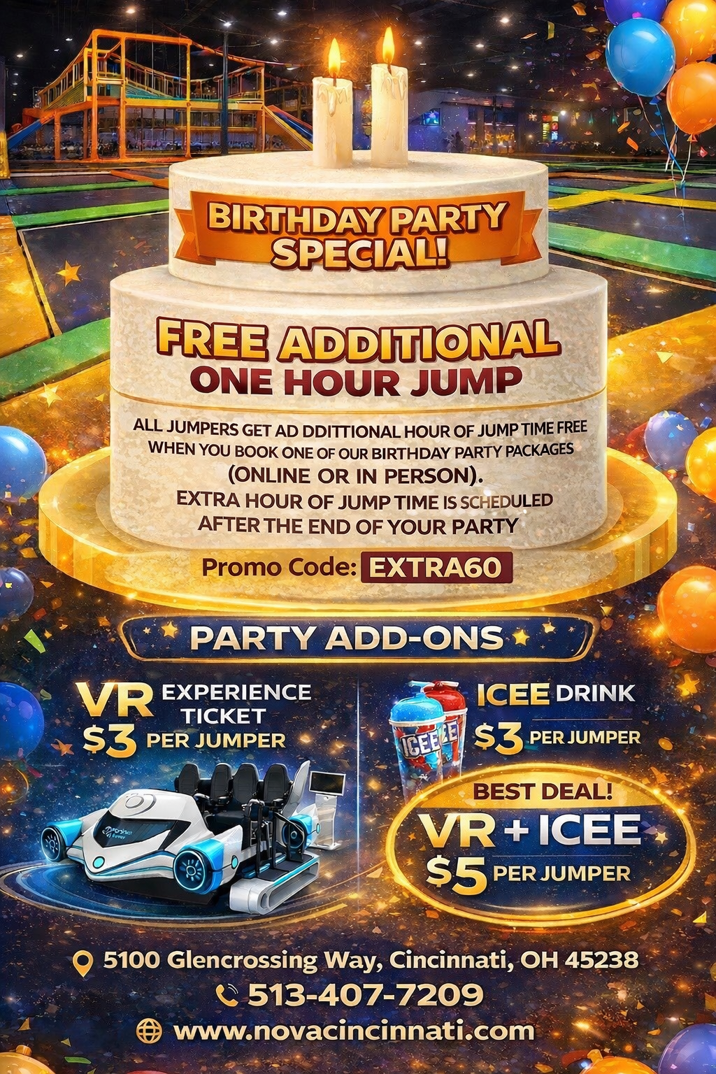 Get ready to have a great time jumping at Nova Trampoline in Cincinnati, OH. Our 50,000 Square ft. facility is located in Ohio at 5100 Glencrossing Way in Cincinnati.